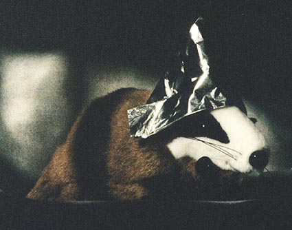 Flew over Doonan Wood. Badger gave a tinfoil beanie to the white wolf. It should block any dangerous C.I.A. radio waves. I don't know if it would have any effect on fleas and ticks, however. It certainly can't hurt.