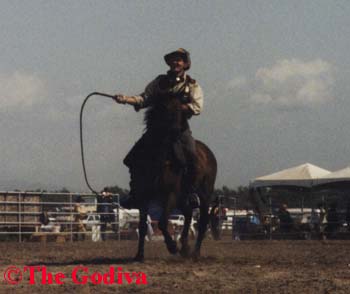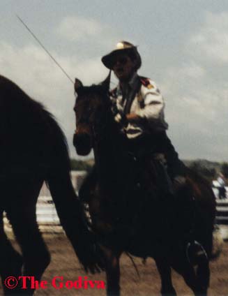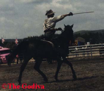 When it was time for their routine they started with the whips, on horseback of course. Colin held a stick of celery out and Anthony rode by full tilt and whipped it in half. Then they went to the sabres. The rode by mannequin heads stuck on stalks of celery which they proceeded to "behead". And then staged a mock battle with each other. If you think regular swordwork is impressive you should see it on horseback. And the danger involved. There final piece was using the revolvers. Then then both jumped the small fences together while riding toward the audience. And a few more poses. (Thanks Whip Snake. Will send jpegs when scanned.)