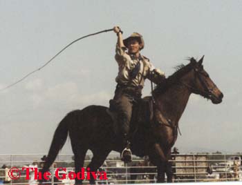 I'd gone to the wrong ranch, so I was late and a little concerned about finding Godiva, Riot, Bright Girl, and Methos Watcher. I needn't have worried. As I watched AdL's act from the side of the stands, I noticed him pointing his saber at someone in the stands and later saluting to someone in the same spot. I just knew that was where my Forumland friends were! I was right. As soon as he came on, Godiva and Riot went to the fence to take pictures, and AdL kept hamming it up for them!
